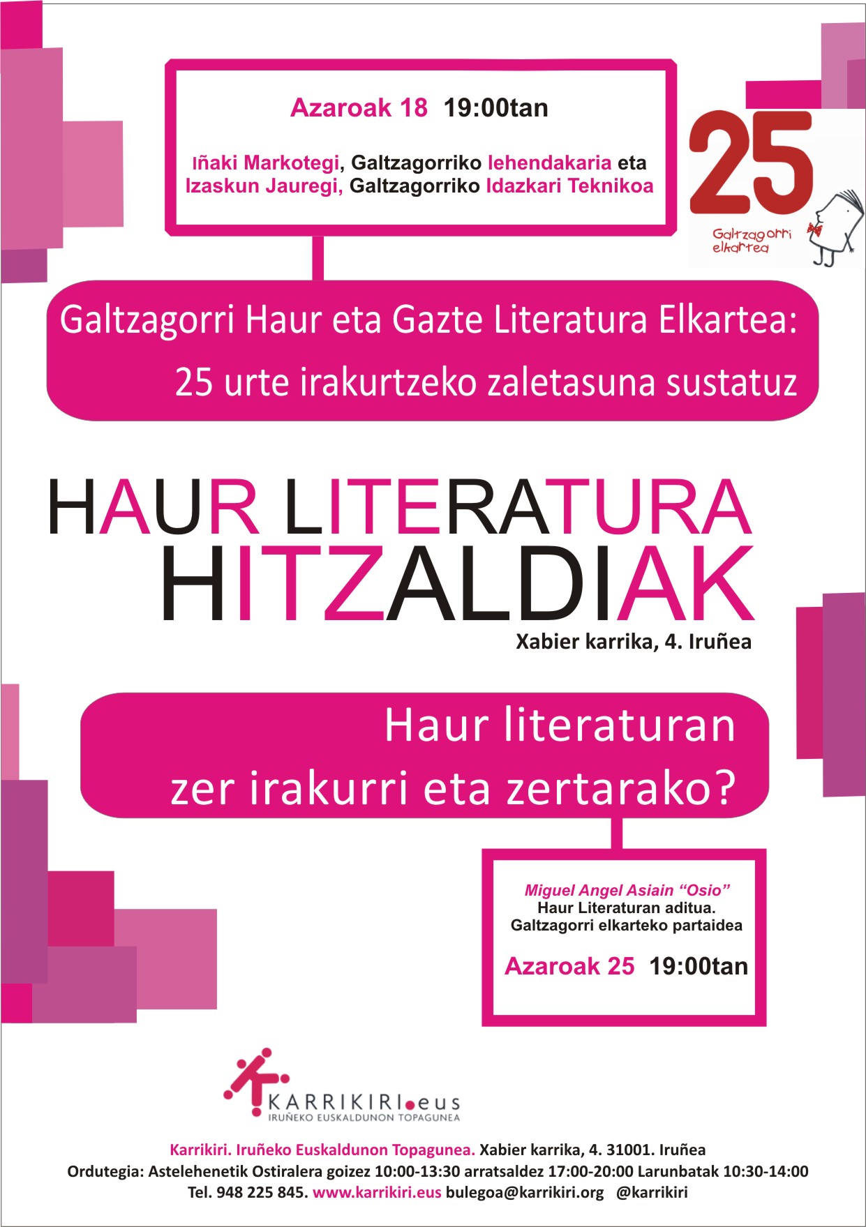 Lehendabizikoa, heldu den asteazkenean, hilak 18, arratsaldeko 19.00etan “Galtzagorri haur eta Gazte Literatura Elkartea: 25 urte irakurtzeko zaletasuna sustatuz” hitzaldia izanen dugu.
