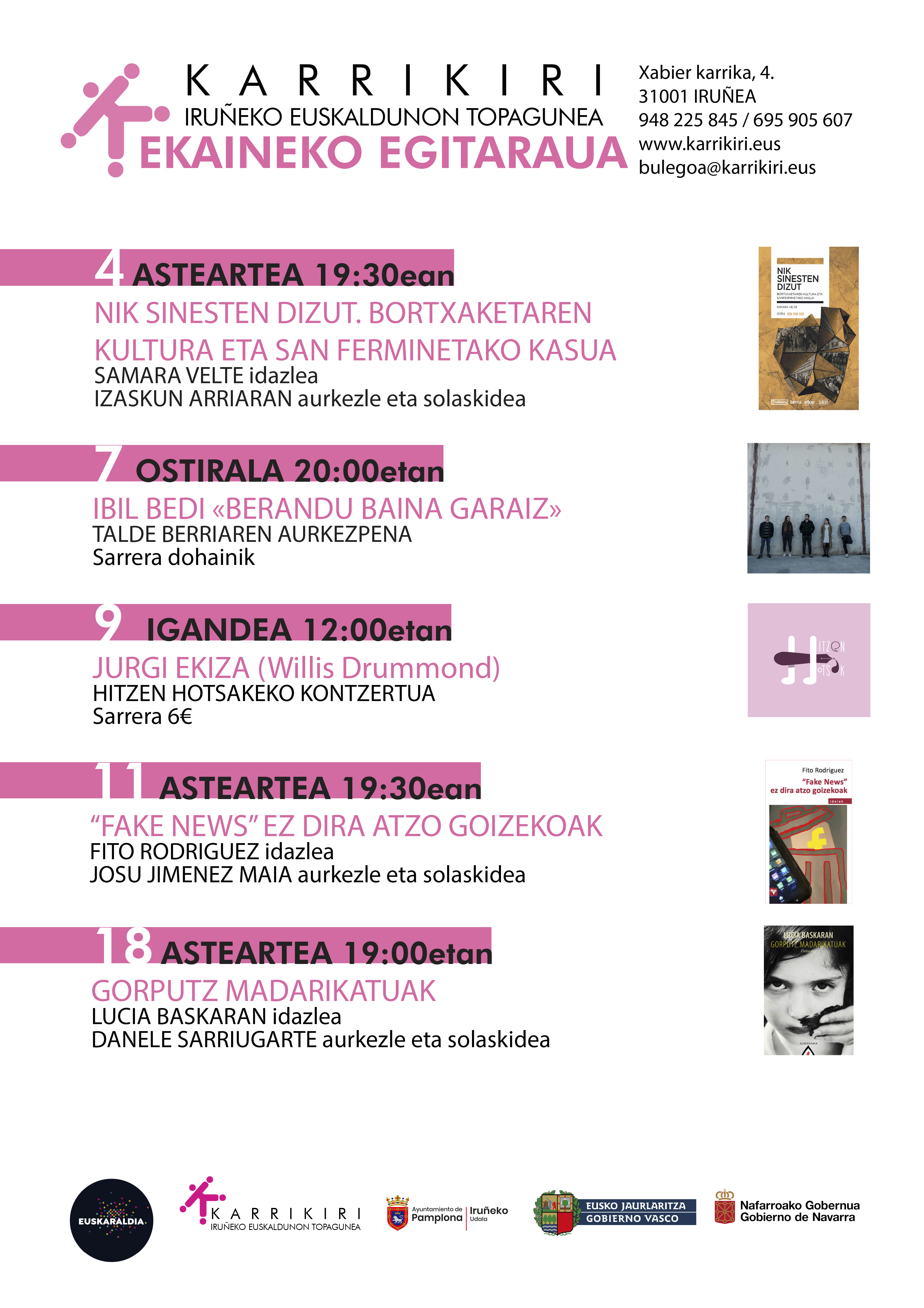 Hainbat sortzaileen bisita izanen dugu; Jurgi Ekiza Hitzen Hotsak-en azken saioan, Fito Rodriguez “Fake News” liburua aurkezten, Ibil Bedi talde berriaren aurkezpena edota Lucia Baskaranen “Gorputz madarikatuak” liburuaren aurkezpena eta solasaldia.