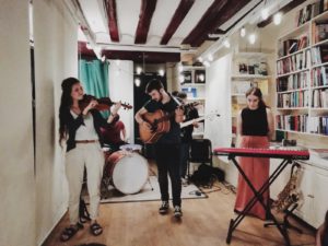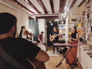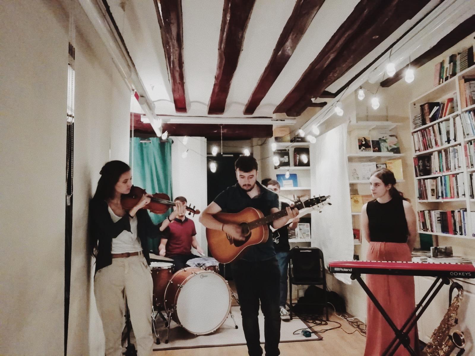 Zain zeuden atean taldekideen senide eta lagunak, baita Iruñeko euskal kultura zaleak ere, ez baita alferrik Karrikiri hiriko euskaldun eta euskaltzaleontzako zutarri eta nukleo. Barnean, betiko liburu eta arropa tartean, sabaitik zintzilikatutako bonbilek argitzen zuten oholtza inprobisatua, Hitzen Hotsak kontzertuetarako erabili ohi duten zoru zatia. Mikrofonorik ez, bozgorailurik ez. Hiru ahotsetan hasi zuten kontzertua pertsona bakar bat gehiago ere hartu ezin zezakeen publikoaren aurrean: Beterik gatoz sendagaiz, gu prest gaude ta hi non haiz, bidea hasi da ta ibil bedi, berandu da baina garaiz. Ez dakit berandu ote zen, baina bai garaiz. Noiz ez da garaiz gitarra, saxoa eta bibolina hartu, baxuari eta bateriari hots egin eta bidean hasteko? Haiek ere bazekiten, ibili ahala garaiz izanen zirela beti.