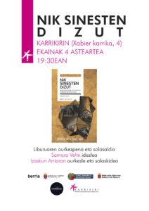 Bihar, ekainak 4, Samara Velte izanen dugu gurean. Bere libur berria aurkeztuko du “Nik sinesten dizut”, morboa aldentzeko irakurketa kritikoa proposatzen digu, indarkeria sexistaren hainbat forma nola gurutzatzen diren agerian utziz. Izaskun Arriaran izango da aurkezle eta solaskidea. Arratsaldeko 19:30ean, Karrikirin.