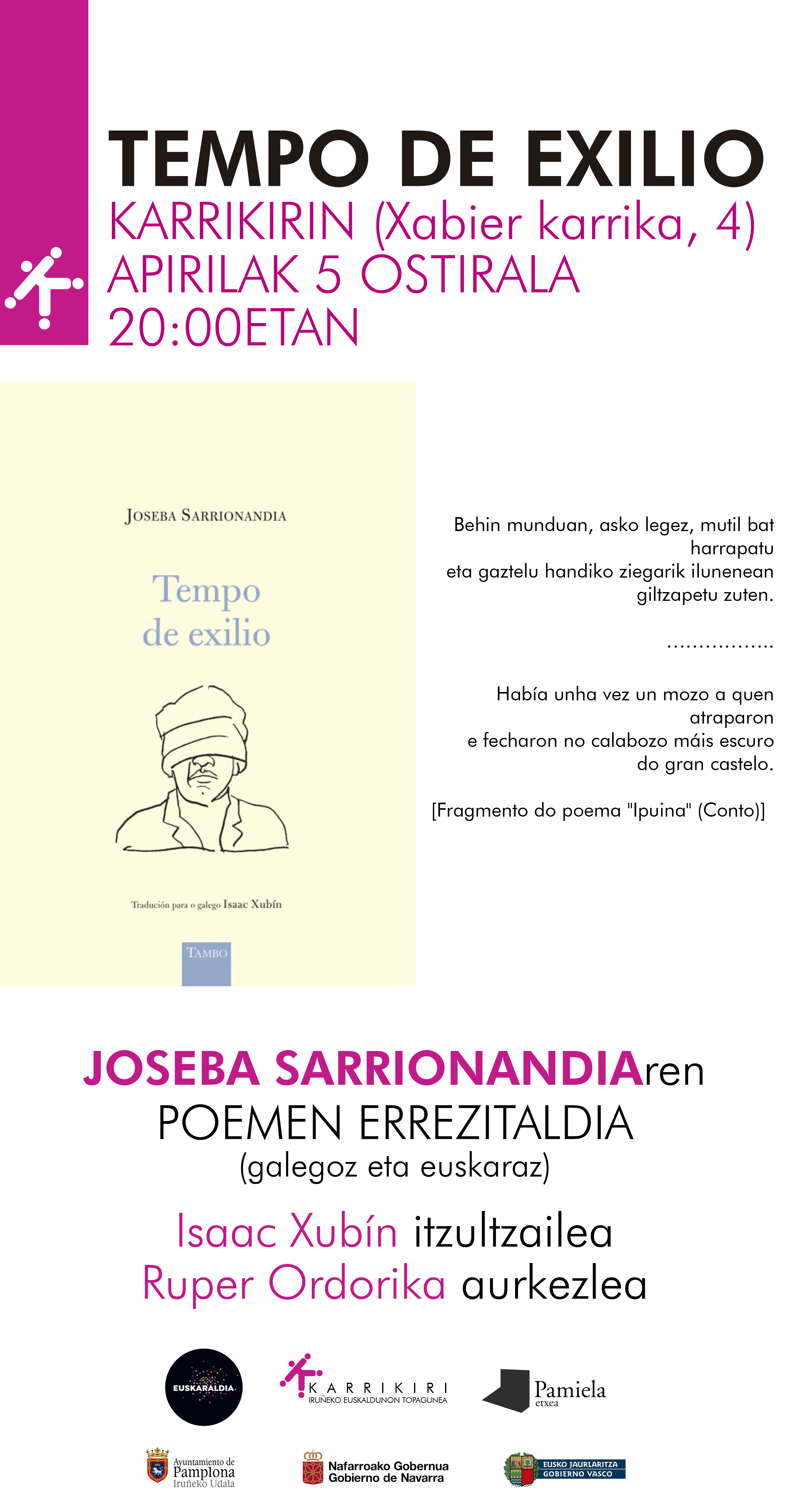 Apirilaren 5ean, ostiralarekin, ‘Tempo de exilio’ liburua aurkeztuko dugu Karrikirin, Xabier karrika 4an. Poema liburu honetan, Joseba Sarrionandiaren poemak biltzen dira, euskaraz eta galegoz, Isaac Xubínek itzuli dituenak. Euskaratik galegora egindako itzulpenak, gazteleratik pasa gabe, alegia. Egilea bera izanen da gurean, eta haren laguntzaile eta aurkezle lanetan Ruper Ordorika izanen du. Ekitaldi irekia izanen da.